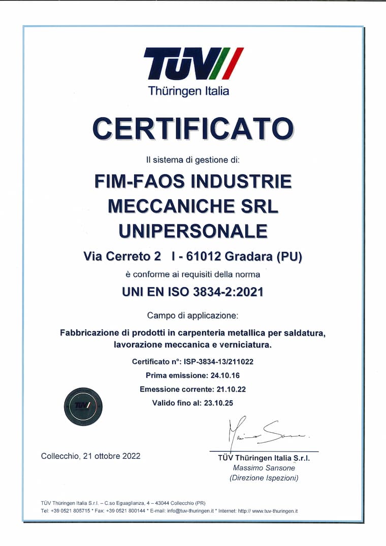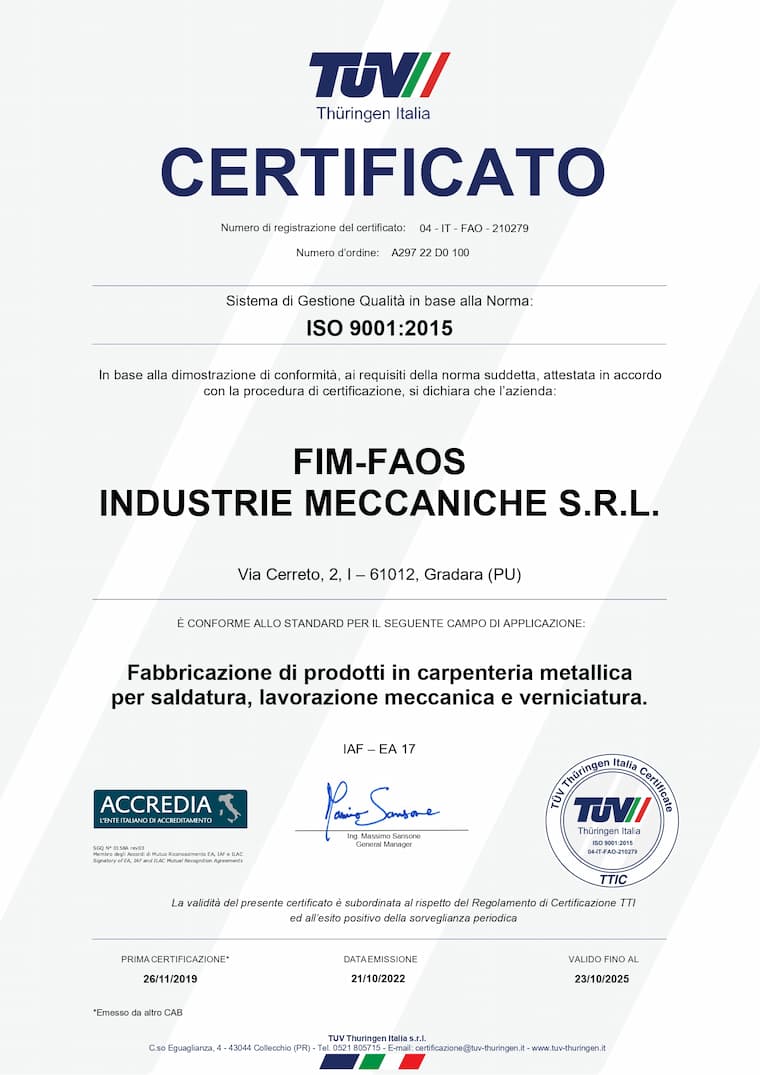 FIM-FAOS Industrie Meccaniche S.r.l. nell’ambito della propria strategia aziendale, considera di primaria importanza la qualità del prodotto e dei servizi offerti, ritiene quindi importante definire al proprio interno regole precise di gestione volte al soddisfacimento dei clienti, dei fornitori e dei collaboratori.